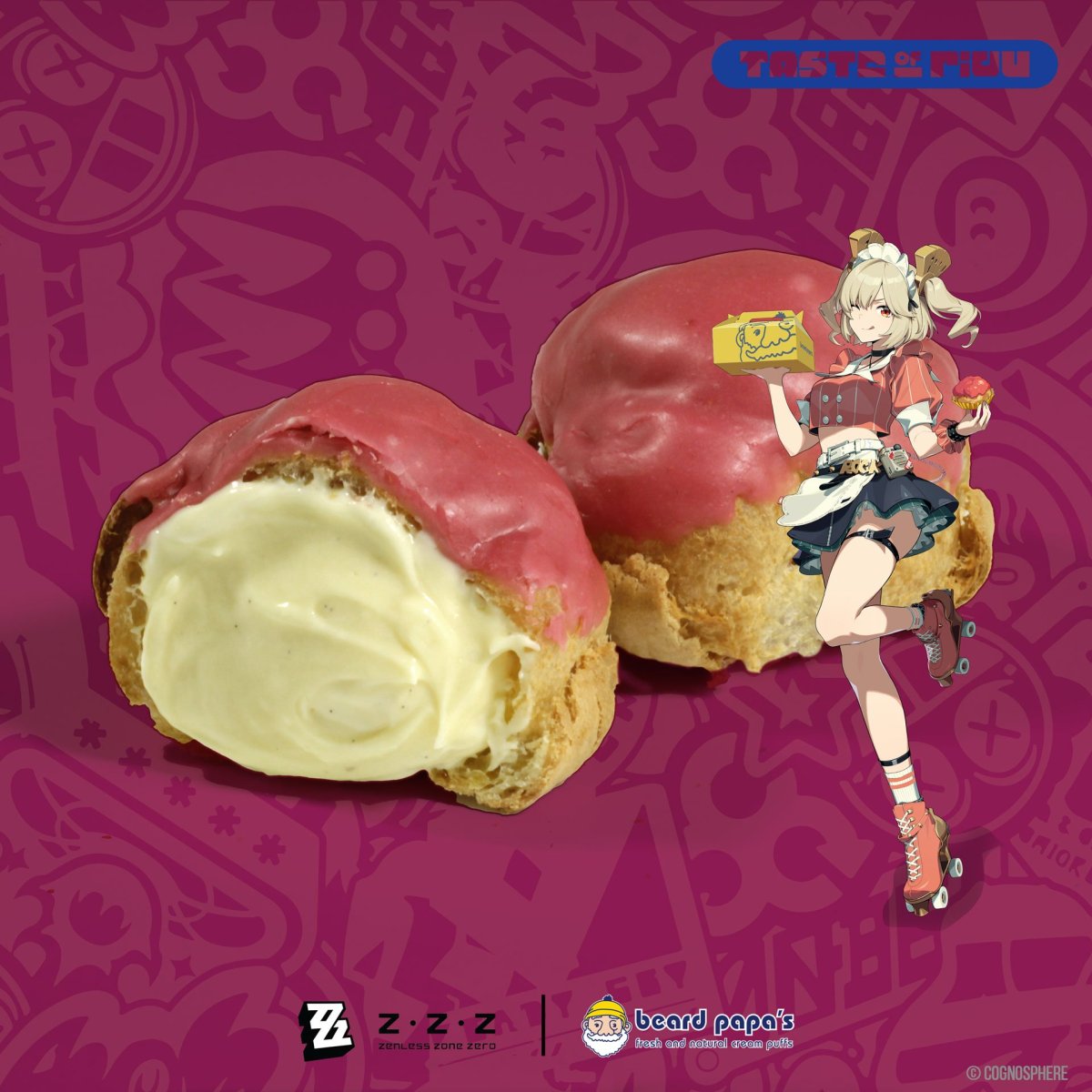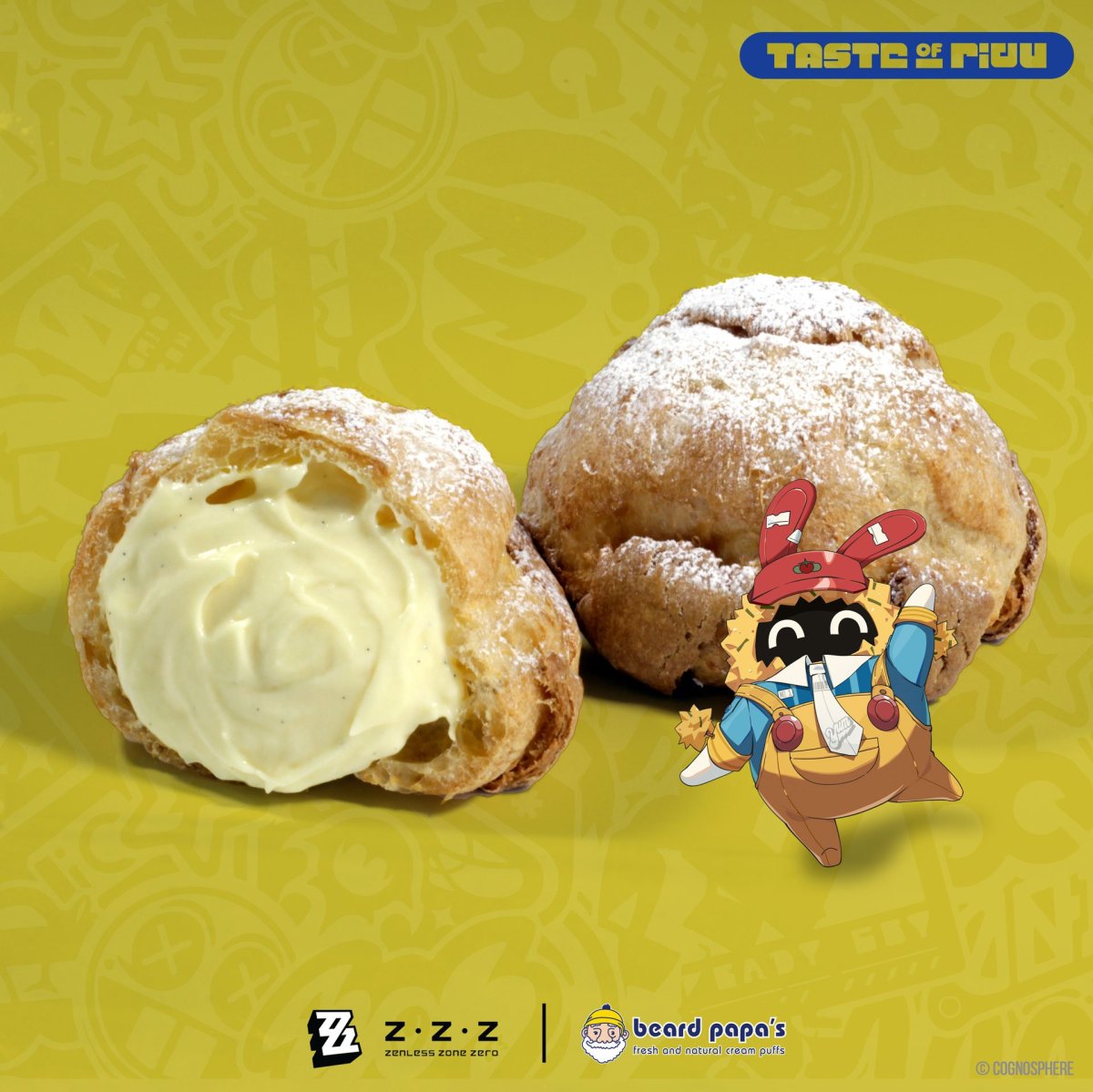 Essentially, the Beard Papa promotion guarantees Zenless Zone Zero merchandise and codes if you get certain collaboration sets. The basic one is called ZZZ x Beard Papa’s Operation Yum Collab 2-Puff Set. This gives you the Anby Key Lime Crumble Puff with vanilla bean filling and key lime topping and the Burnice Royal Raspberry Puff with vanilla filling and raspberry glaze. You also get one random pin with either of the two characters or a Bangboo mascot in the restaurant’s costume and the Perfect Taste Bundle code. The 4-puff set comes with both of the limited edition cream puffs, two Original Vanilla ones, an acrylic standee of one of the two heroines and the code. Finally, a 6-puff set comes with two of the Anby puffs, two of the Burnice ones, two Original Vanilla ones, a standee, a random pin, and the code.