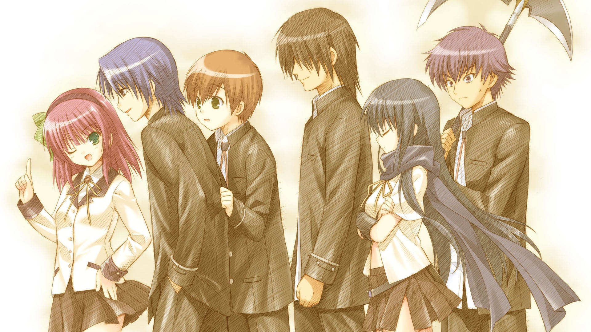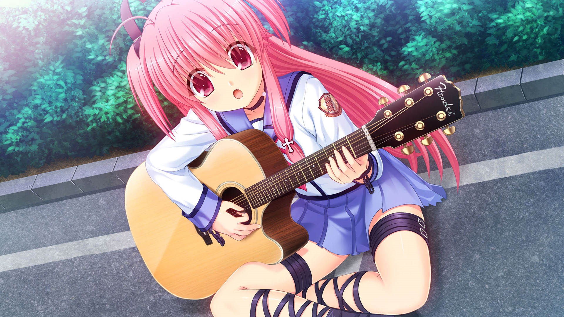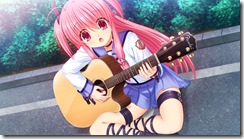 I’ve always wondered why women wearing skirts in anime always somehow end up going ahead of the dudes when they’re climbing up ladders or crawling along ventilation shafts. And in Angel Beats! 1st Beat, you’ll have to ponder the same problem, too, judging by some of these CGs. The game is a classic visual novel, slipping players into the role of amnesiac Otonashi Yuzuru. In the game series, Otonashi ends up in a after-life limbo school, where people go to “let go” of their past. Instead of doing so however, some are raging against God—one of them being Nakamura Yuri, who leads the Afterlife Battlefront. During one fight, they accidentally trigger a pitfall trap where Otonashi is clinging on to Yuri’s legs. He’ll have to climb up and out over her, but can’t quite look up. Hmm.. Some other CG for the upcoming game includes Yui, who’s part of the diversion group Girls Dead Monster band as she practices on a guitar. Angel Beats! 1st Beat will have multiple endings and there are six “beats” planned for the series.