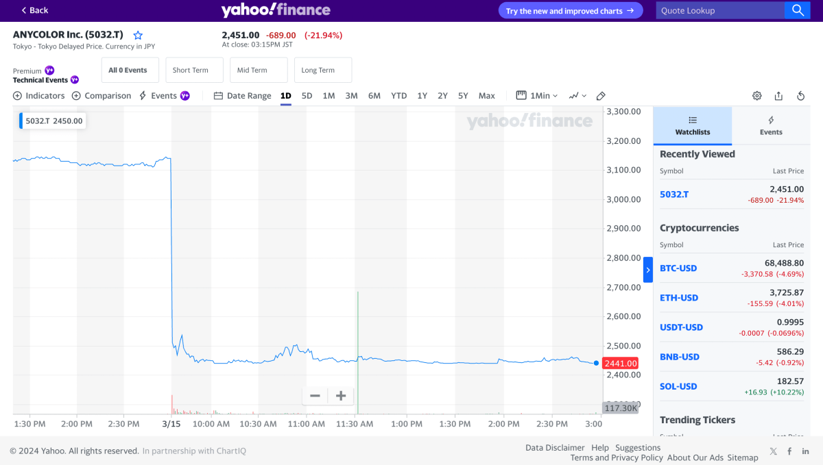 On March 14, 2024, Anycolor released its Financial Results of FY2024 4 Q3 that went over its various Nijisanji Vtuber branches. Now at market close on March 15, 2024, Yahoo Finance noted the stock price went from 3,140 yen (~$21) on March 14, 2024, to 2,451 yen (~16) on March 15, 2024.