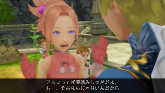 Xseed, we know you’re busy with Retro Game Challenge, Muramasa: The Demon Blade, and a rebalanced version of Valhalla Knights 2 which comes out this week. After you’re done with those please pick up Arc Rise Fantasia. We know Marvelous is thinking about working with you to publish Arc Rise Fantasia in the USA thanks to the existing co-publishing agreement. The Wii could use another RPGs and it would be great to have someone to finalize the name of the sword carrying male lead. The katakana for Raruku, a romanization of the main character’s name, is also used for L’arc as in the pop artist L’arc en Ciel. Is his really going to be name L’arc Bright? The girl with a shy look and a flower in her hair is Ryfia. Alphonse, also shortened to Alse, is the expressionless blue fighter and Adele is the magic user wearing pink. Don’t confuse her with Leslie, the other magic user wearing the awkwardly revealing pink bra while casting a spell in battle.