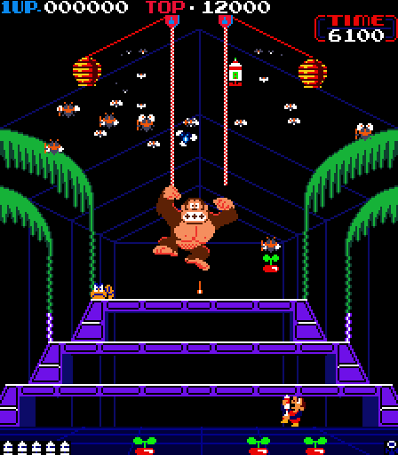 Take on the role of the hero Stanley, and use your Sprayer to drive away Donkey Kong and exterminate the various flower-stealing bugs that appear in the botanical garden. Get high scores with a perfect bonus by chasing off Donkey Kong and having no flowers stolen!