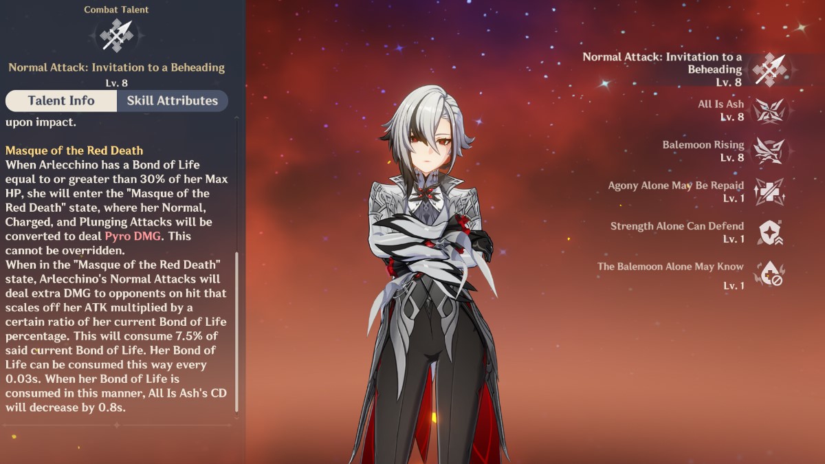 - When Arlecchino uses her Normal Attack while Bond of Life is active and has consumed 30 percent or more of her HP, all her attacks will be infused with Pyro.
