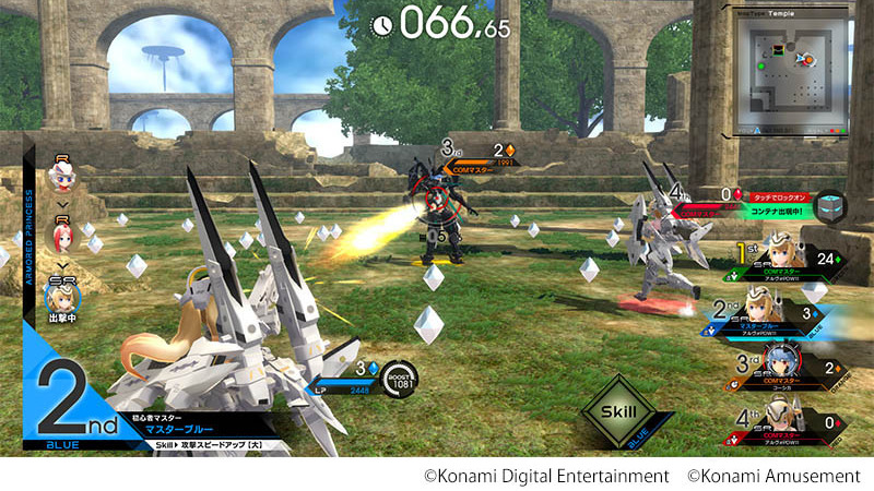 Konami finalized the launch date for the new Busou Shinki arcade game, Armored Princess: Battle Conductor. It will be available in Japan’s arcade game centers starting on December 24, 2020. [Thanks, 4Gamer!] The general gameplay system for the new arcade game was explained in detail at JAEPO 2020. A player can use three Shinki units by either renting digital units or scanning cards generated from the Card Connect printer machine. The player can then customize armaments for each unit before sending them as a team into a four-player battle royal. The objective in the battle is to collect gems scattered all around the map until the time runs out. A player’s gem collection can also be reduced if their unit is shot down by other opponents. Busou Shinki is a series of mecha-musume action figures released by Konami since 2006. The PC online service Shinki-Net, which consisted of the Busou Shinki: Battle Rondo duel game and a virtual diorama studio, was established in the same year, but shut down in 2011. Konami also released a couple of games related to the franchise on PlayStation Portable. Busou Shinki: Battle Masters was released in July 2010, and its definitive Mk.2 upgrade followed in September 2011. After a long period of dormancy, Konami announced the revival of the franchise at JAEPO 2020 with not only Battle Conductor but also a new mobile game titled Busou Shinki R, which is currently still under development. Armored Princess: Battle Conductor will launch in Japanese arcades on December 24, 2020.