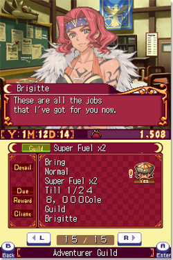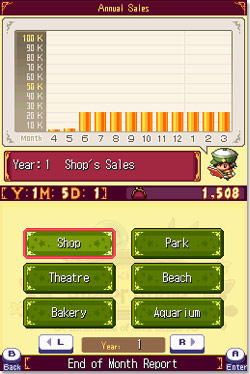You do this by investing your money in new ventures and / or by renewing existing ones to boost their income. The former just requires spending money. The latter is done by doing the available jobs at the various facilities you’ve established. For example, one of the jobs at the park involves finding a mascot for it. Another involves getting 30 units of a certain alchemical ingredient in order to set up a clean water supply. Performing jobs at the facilities you own doesn’t earn you money; instead, it increases their fame, which again contributes to your income. An increase in fame also enables you to pour more money into your existing properties, which brings in more customers (thus, again, contributing to income). One of our readers compared it to Rune Factory, but unlike RF, you aren’t performing the role of a labourer and a manager — just the latter. At the end of each month, you get to read a report on how business is holding up across each of your facilities along with a handy bar graph that shows growth or decline in profits on a month-to-month basis.