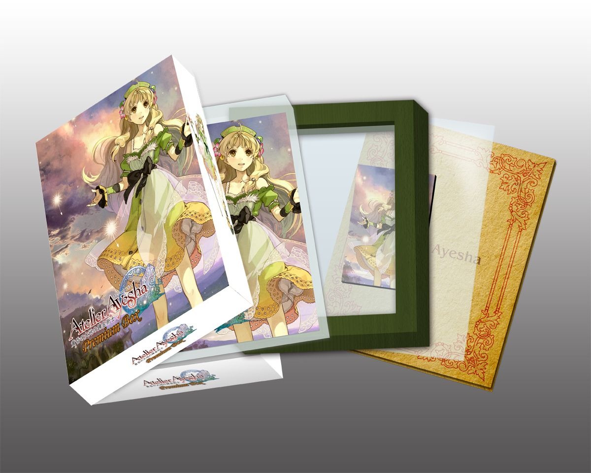 After packing crystal paperweights with three Atelier games, Gust decided to create a new kind of bonus for Atelier Ayesha. The premium box has a wood frame and a 13.5cm by 17cm illustration. A booklet with a world overview and, of course, a copy of Atelier Ayesha is also in the 10,290 yen ($130) limited edition.
