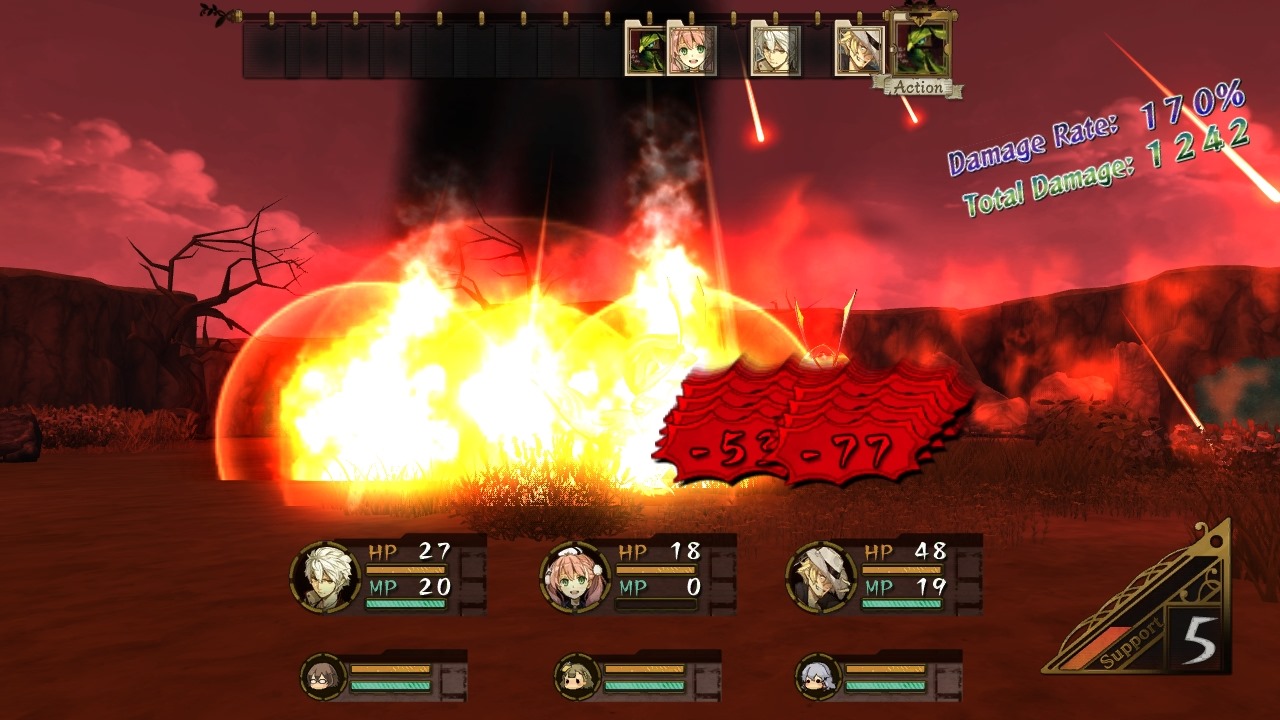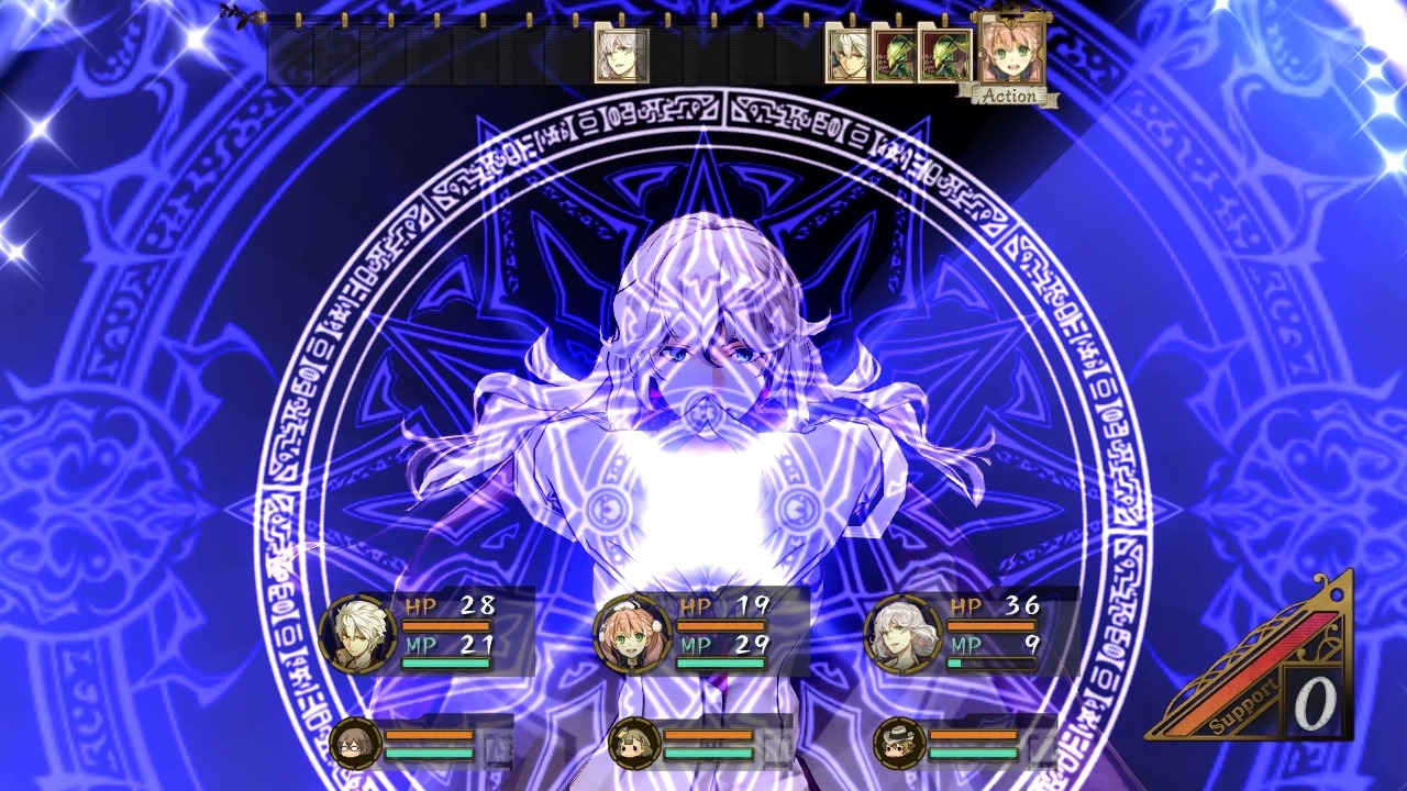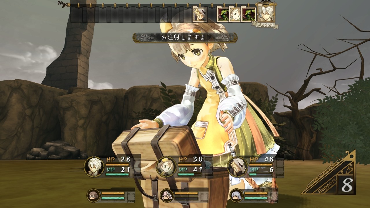 Gust is making changes to the Atelier battle system by upping the number of party members to six. In Atelier Escha & Logy: Alchemists of the Dusk Sky characters are split into front and rear rows. Characters can do support attacks if you have energy in the meter in the bottom right. Monsters still show up on fields and if you strike them on the field you can attack first in battle.