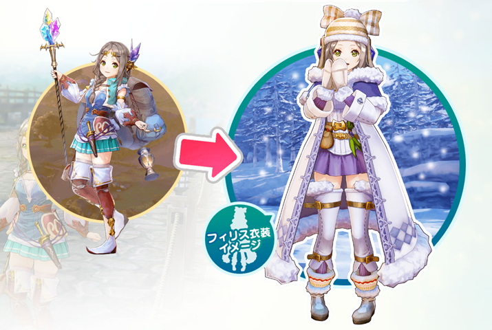 Bernd is the elder of Firis’ hometown of Ertona. He’s a considerably great man, but doesn’t show it with attitude. He’s been stressed due to the low amount of minerals that they’ve been producing in recent years. He’s also conflicted because he has expectations of Firis’ mining capabilities, but also knows about her dreams. And finally, here’s a look at some costumes that provide some extra effects: Snow Bright
