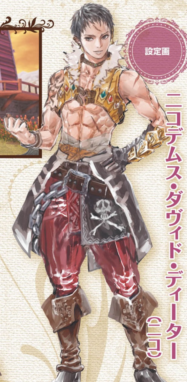 A sailor called “Nico of the Raging Waves.” Nicodemus is a young man who was previously a pirate but after his ship got destroyed by a certain person, he became an adventurer. He spends his days taking on various requests in order to make money to fix his ship.