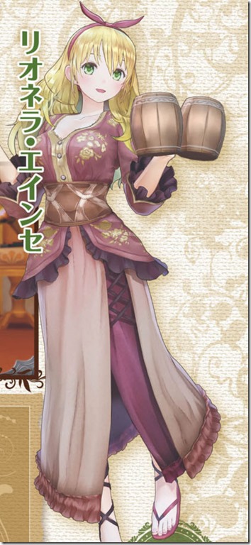 Lionela previously appeared as a street performer in Atelier Rorona. She used to be extremely shy but after meeting Rorona she’s gotten better. In Atelier Lulua she appears as the owner and bartender of a bar called AraHoro Arbor.