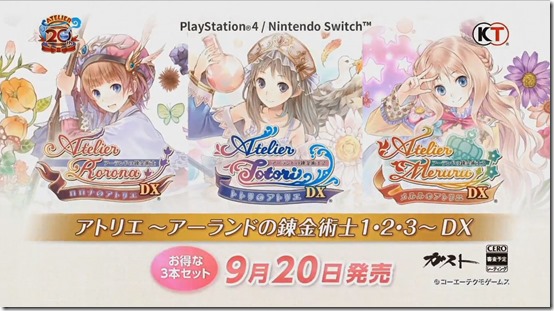 A digital version featuring all three games will also be available for 10,800 yen. Atelier Rorona: The Alchemist of Arland DX, Atelier Totori: The Adventurer of Arland DX, and Atelier Meruru: the Apprentice of Arland DX release in Japan on September 20, 2018 for PlayStation 4 and Nintendo Switch.