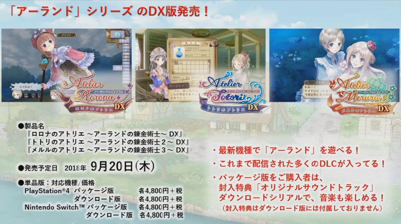 Gust announced that the Arland series is headed to PlayStation 4 and Nintendo Switch with Atelier Rorona: The Alchemist of Arland DX, Atelier Totori: The Adventurer of Arland DX, Atelier Meruru: the Apprentice of Arland DX.