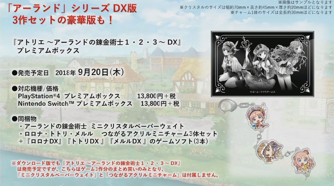 A limited edition Atelier ~Alchemists of Arland 1, 2, 3~ DX Premium Box will be available featuring all three games for 13,800 yen plus tax. Here’s what’s included in the set: