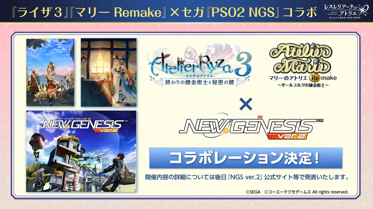 Koei Tecmo announced that a collaboration with PSO2: New Genesis will bring characters from the Atelier Ryza and Atelier Marie games to Sega’s action-MMORPG. It was also revealed that the collaboration will receive a worldwide simultaneous release.