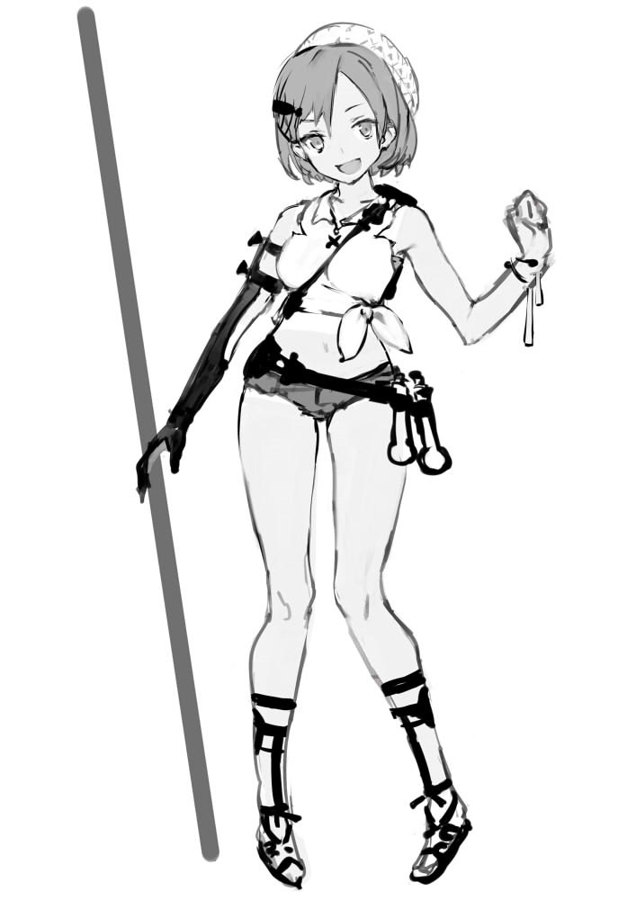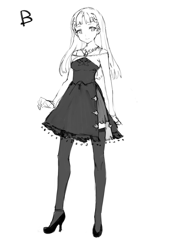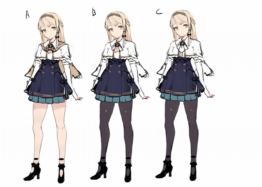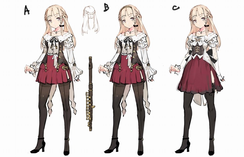 Junzo Hosoi: “The first designs stressed the slit on her skirt more. However, adding a slit to the skirt makes it lose a bit of that ojou-sama feel, so we went with with something different from that design.” Toridamono: “Since it’s a character that plays the flute, I thought about having her wear a tailcoat like the ones conductors wear, but something felt off about that.”