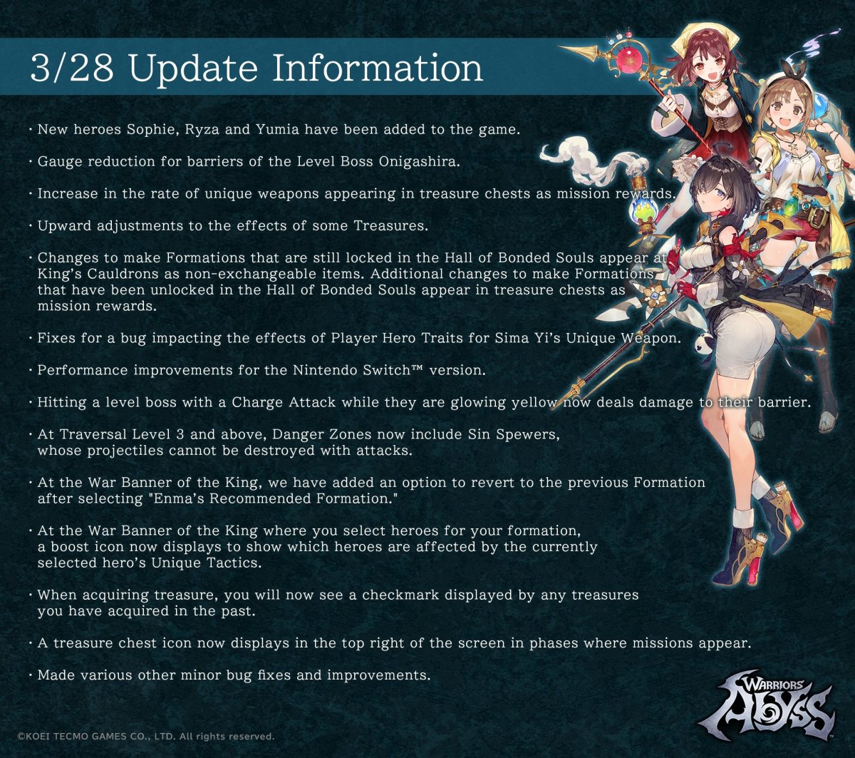Warriors: Abyss is available now on the Switch, PS4, PS5, Xbox Series X, and PC, and the Atelier Ryza, Sophie, and Yumia freeDLC is out.