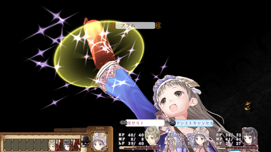 Similar to Atelier Rorona, Atelier Totori has an assist system. Party members can take hits for Totori or jump in for an attack. Each partner attack fills up the special attack gauge. When it’s full, select special attack to do a flashy move like these.