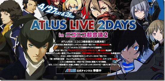 Atlus have announced the “Atlus Live 2 Days” event, as part of NicoNico’s Super Meeting 2, which will be taking place at the Makuhari Messe convention center, in Chiba Prefecture, where they’ll have presentations related to their Nintendo 3DS games, including playable demos of Shin Megami Tensei IV and Devil Survivor 2: Break Record. Atlus Live 2 Days starts next Saturday, April 27th, from 10:00 – 18:00 (Japan time). It will continue the next day starting at the same time until 17:00. The event schedules have not been announced yet, but Atlus will have numerous events related to their three upcoming 3DS games—Shin Megami Tensei IV, Devil Survivor 2: Break Record and New Etrian Odyssey: Millennium Maiden.