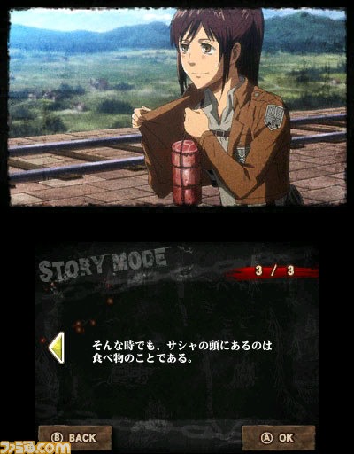 Spike Chunsoft’s Attack on Titan game has Eren, Mikasa, and Armin built into the Nintendo 3DS game. Levi’s chapter is available as free downloadable content until January 31, 2014.