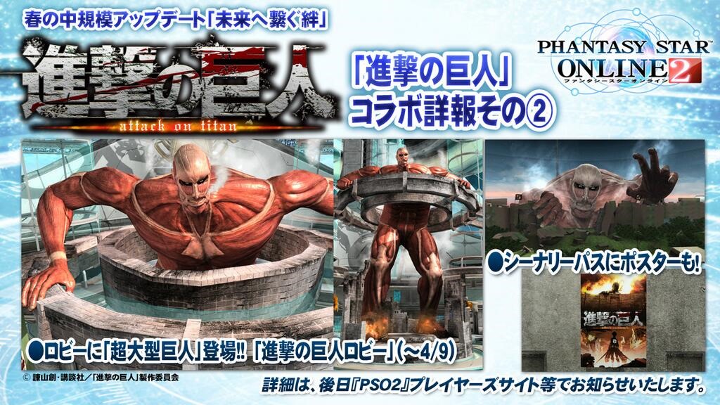 Additionally, the Colossal Titan will be hanging out in the lobby and in the background, but don’t worry, he won’t attack. There will also be various Attack on Titan posters scattered around town, as well. The video above a closer look at the Attack on Titan content that was shown in a recent Phantasy Star Online 2 broadcast. The footage gives us a look at the costumes featuring characters that resemble Eren and Mikasa, along with their Twin Dagger and Wired Lance in action, which actually looks quite fitting with the collaboration gear. Attack on Titan will be invading Phantasy Star Online 2 this Spring.