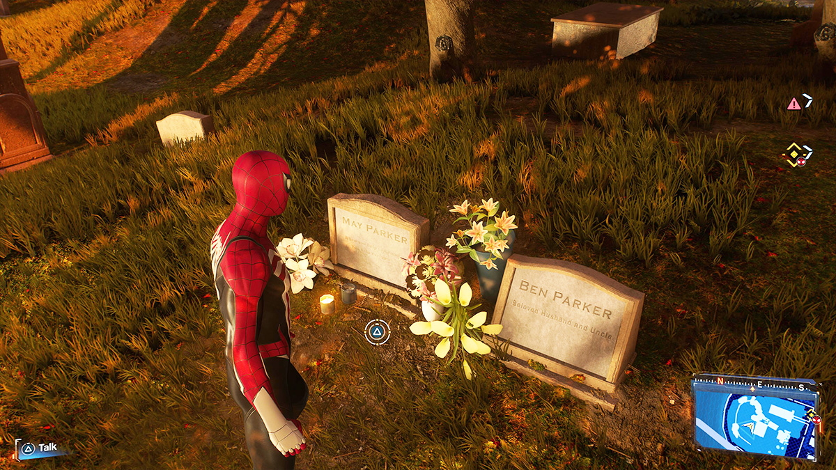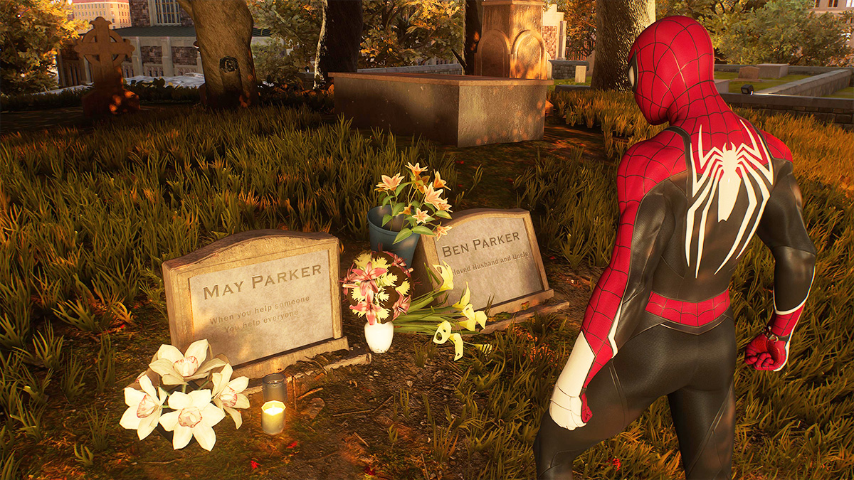 Once you enter the cemetery, walk to the northeast corner of the map and look for an interactive circle icon on the ground. After getting close to it, hold the Triangle button down on your DualSense controller to trigger a cutscene of Peter Parker visiting Aunt May’s grave.