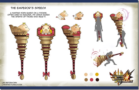 A while ago, Capcom held a weapon design contest for Monster Hunter 4 Ultimate in North America and Europe. Capcom said they would choose two winners—one from each territory—whose weapon designs would be turned into actual in-game weapons. This morning, they revealed the winning design from Europe. Dubbed “The Emperor’s Speech,” the weapon you see above is a Hunting Horn based on a Poogie theme. It was designed by a Lin Setzekorn, and you can see their design and description for it below.