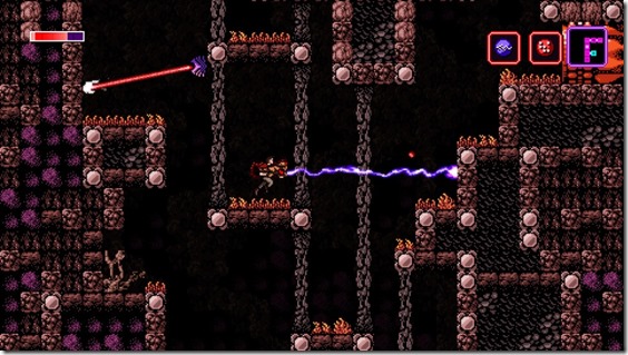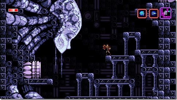 There are a lot of tools to unlock in Axiom Verge but, out of them all, the one that’s been given its own button is the drill. Does that mean it has a particularly important role in the game? What are the different ways in which it can be used? Actually most of the tools get their own button; just that for the sake of the demo, only the drill is shown on the controller screen. You’d be overwhelmed if introduced to all the items at once and expected to remember their buttons from the outset. Once you begin collecting items a brief popup explains which button to use. The final version will allow you to map all the buttons as you see fit. However, the drill is important in that it’s the first tool you get and it’s useful from start to end (e.g. isn’t like Zelda where you only use it in one dungeon and then never again). It’s mapped to the right trigger so that you can have the feeling of using a hand-held power drill. Being a game with so many upgrades and weapons / tools, it seems necessary to ask why? Presumably they don’t need to all be found to get through the game, so are they there to encourage exploration? Do they allow for customization? Maybe they also suit different play styles? The answer is basically yes to all three, though the primary focus is to incentivize exploration. In general I always try to offer the possibility of finding something new and useful and entertaining in and of itself rather than just incrementing a counter (though I have health/power/range/size upgrades that do just that). You use cutscenes and dialogue to tell parts of the story, but there seem to be more subtle techniques too – a skeleton I saw provoked some questions. Are you making players piece together the story through implication? And if so, how have you designed the game around this idea? There are certain things that you are told directly via dialogue and certain things (like the skeleton) which are there for you to piece together. I’m suspecting that most people will just accept what’s told in the cutscenes, but if you read into certain other clues you might pick up on something entirely different.