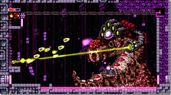 Tom Happ has been working on Axiom Verge for the past four years by himself. It’s a big undertaking, and one that he’s had only himself to rely on for motivation, geeing himself up after working a full day at game studio Petroglyph. We’re talking about a game with over 40 weapons and tools, over 60 upgrades, about 70 creatures, and about 700 rooms. Considering how much work this much be (especially for one guy), it’s not too surprising that he’s recently brought on former Nintendo business development manager Dan Adelman to help him out with the marketing side of things as he gears up for a release in early 2015 on PlayStation 4, PlayStation Vita, and PC. Siliconera wondered what would drive someone to do this to themself – why would you work on a long-term project by yourself, letting it eat up all your free time? To find out, we threw some questions at Happ, who had somehow found a spare hour or so to kindly answer them for us. Happ tells us what aspects of Metroid, Contra, and Blaster Master – which he lists as the game’s biggest influences – he has taken and reworked for Axiom Verge. He also tells us how he came up with the idea of deliberately using glitches as a way to find a unique source of fun in the game. Happ also dives into how he’s designing a game that he hopes will encourage people to speedrun it, just as so many people speedrun Super Metroid. What specific aspects of Metroid, Contra, and Blaster Master are you trying to re-capture in Axiom Verge? All of the gross biological alien environments in the demo have brought back some memories for me. Tom Happ, solo developer: With regards to Metroid, it’s mostly about level design and to some extent creature design. The design of individual rooms (composed of discrete blocks) hearkens to the original NES Metroid and Kid Icarus. The overall world map layout is more inspired by Super Metroid, as are much of the creature behaviors, which have something of a rudimentary ecology built in. The controls and weapons borrow more from Contra; you move and turn instantly, and jumping is faster. Each weapon is supposed to feel like a new toy which you can play with and experiment, each being useful in certain situations with none being strictly superior or inferior. The difference is that once you find a weapon, you keep it forever, rather than losing it on death or on collecting a new weapon. Blaster Master, like Metroid, informs the level design (sprawling underground world) and an ability you get (much later than seen in the demo) that gives you an alternate method of exploration. There aren’t overhead scrolling sections, though … sorry that I can’t say more than that!