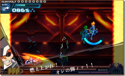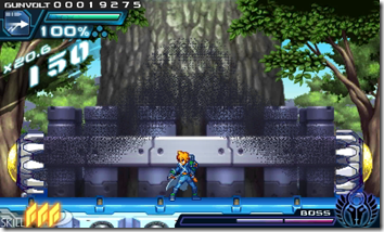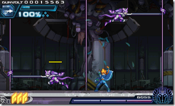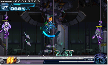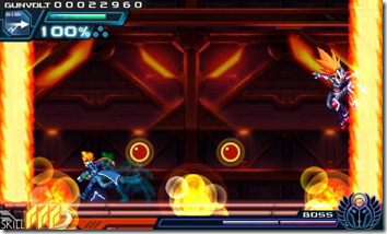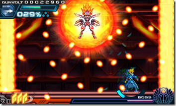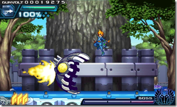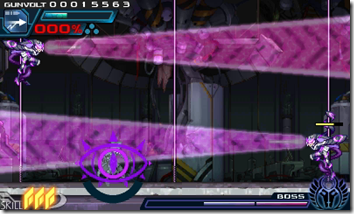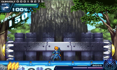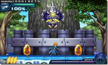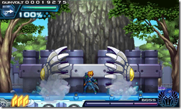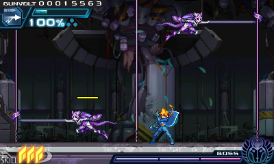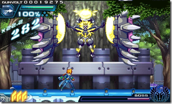 Stratos’ Special Ability: Stratos gathers flies from devices on the right and left sides of the screen to turn into a giant and deliver a single devastating attack. Either Stratos needs to be defeated or the devices need to be destroyed before the transformation is complete. Azure Striker Gunvolt is in development for the Nintendo 3DS and will be released in North America and Japan this Summer.