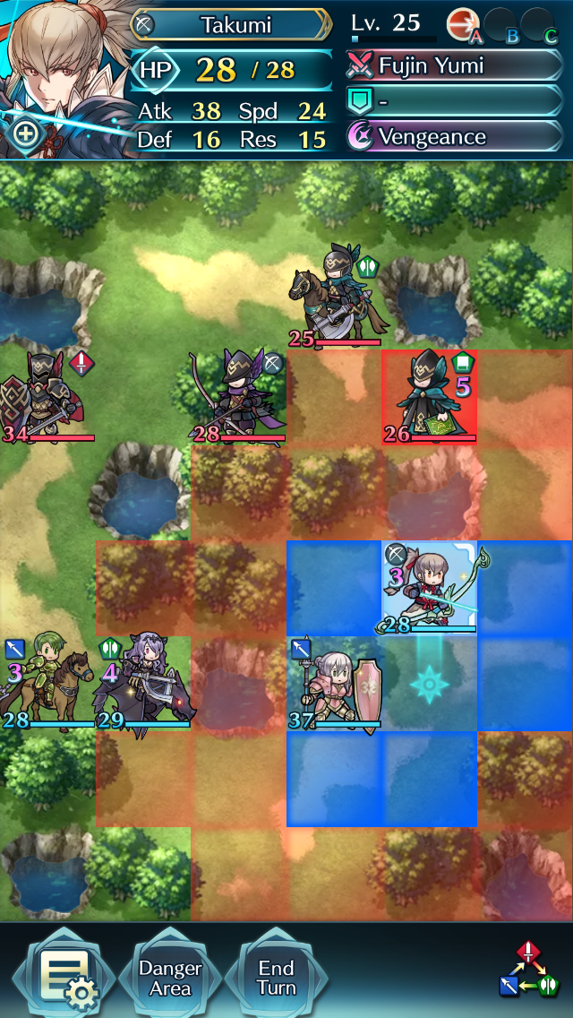 IMG_3287 Also, you’ll want to use Takumi. There are a lot of really good characters in Fire Emblem Heroes. People like Ryoma, Camilla, Lyn, Hector, Tiki, Leo, Linde, Cordelia, and Marth can be great. But Takumi is on a whole other level. He has amazing growth rates. He has Close Counter, a skill that lets him deal with close range attacks. Vengeance can be improved to grant 50% bonus to attack for damage he’s suffered. He has Fujin Yumi, which lets him pass through foes if his health is under 50%. Keep this guy in your crew.