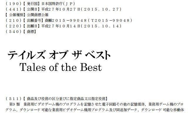 The latest trademark filed by Bandai Namco is shown as “Tales of the Best,” which was done today on October 27th. [Thanks, Game Jouhou.] While we don’t have any clues as to what Tales of the Best will be, by the sounds of it, it could be some kind of fighter or something else with a bunch of Tales characters. It could also be a collection of Tales games or a smartphone title.