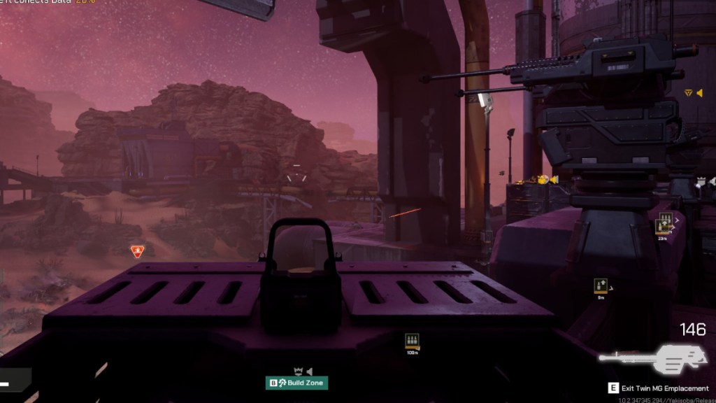 Once on defense, the bug horde will crawl out of every crevasse to assault the base. Even with 15 other players to cover your flanks, you’re going to be swarmed quickly. It helps to have bigger guns. The Turret MG Emplacement and Sentry MG are essential components of any properly fortified base. With 300 rounds each, these turrets are capable of squashing bugs from farther away in fewer shots. What’s more, using turrets saves your personal cache of ammo for proper emergencies- like when the bugs breach the walls of your base. The Turret MG is manually-operated, but the Sentry MG is automated, helping your team cover their blind spots. Paying attention to where your Sentry MG is pointing is also a good way to keep track of where the bugs are coming from. Just make sure to keep ammo stockpiles for those turrets nearby.