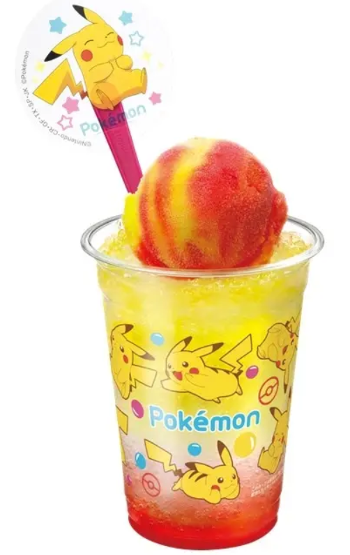 The limited-time flavor is Pikachu and Hogeta’s Fruit Ice, which combines seven different fruits—golden kiwi, pineapple, passion fruit, strawberry, blood orange, pink grapefruit, and mango. You can get this as a single scoop or a double. If you get a double scoop, you have the option of getting it in a cup. There are three variations, each featuring Pikachu hanging out with one of the starter Pokemon from the Paldea region.