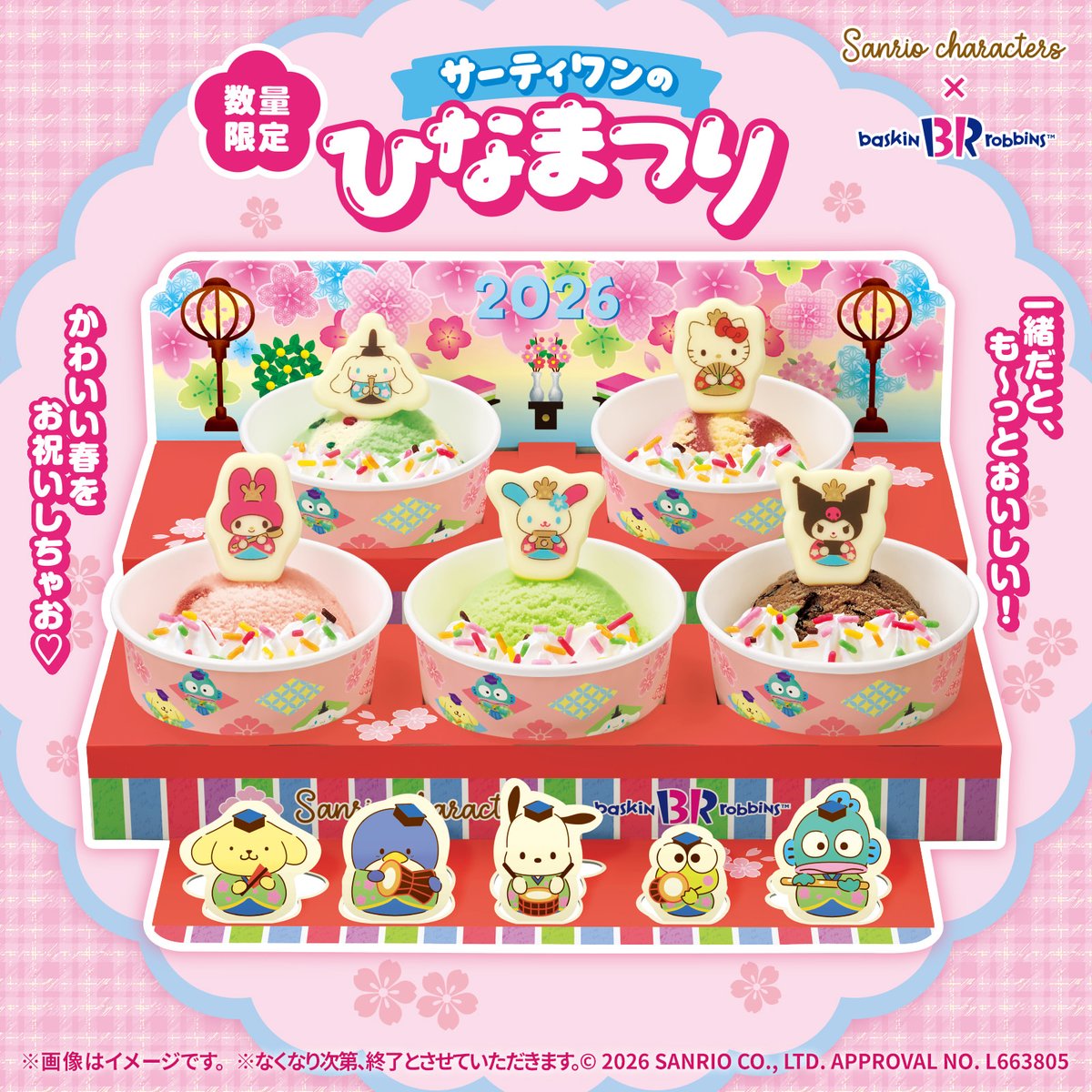Sanrio and Baskin Robbins announced a Hinamatsuri sales event in Japan that involves ice cream in a hinadan stand box with Sanrio characters as hinakazari doll decorations. It will be available in stores starting on February 15, 2026, then run until the festival itself starts on March 3, 2026. It will cost 2,400円 (~$15.40).