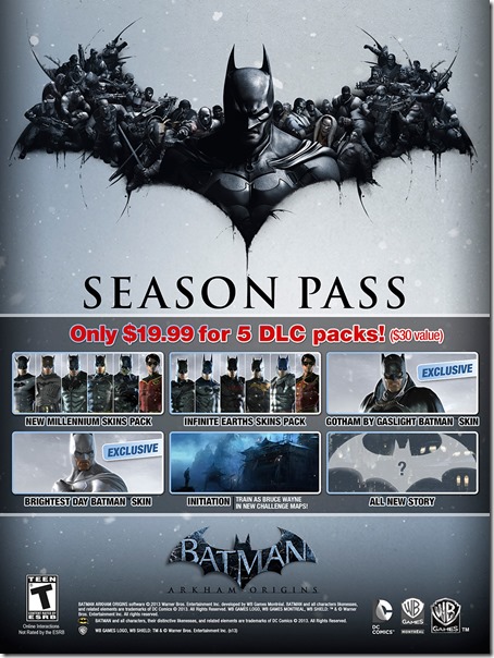 The language Warner Bros. use in their announcement makes it sound like Batman: Arkham Origins will have more DLC than the content included in the season pass, but this hasn’t been detailed yet. Batman: Arkham Origins will be available on October 25th for PC, Xbox 360, PlayStation 3 and Wii U.