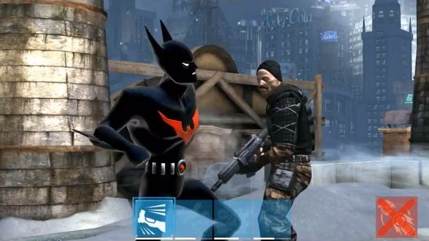 For comparison, above is an image of the Batman Beyond suit from Batman: Arkham City (on the extreme left). The suit was sold as part of a $5 DLC pack containing other outfits like Earth One Batman, the 1970s Neal Adams Batman, the Batman from Batman the Animated Series, and more. Oh, and to the right of the Batman Beyond suit is the Dark Knight Returns suit in Arkham City. That one looks more or less the same. Unfortunately, we’ve never gotten the Batman Beyond suit in its animated cartoon style in any of the mainline Arkham games so far. It did make an appearance in the mobile version of Batman: Arkham Origins, though, which you can see below. ![]()