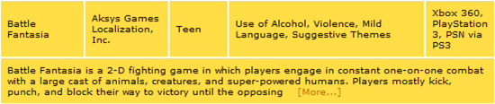 Now things have changed. It looks like there is a chance the PS3 version of Battle Fantasia could come to North America in a rather peculiar way. The ESRB re-rated Battle Fantasia as an Xbox 360, PlayStation 3, and “PSN via PS3 game”. Huh. So, Aksys is planning to distribute a retail PS3 game as a PlayStation Network download? We’ve seen this happen before with games like Warhawk, Gran Turismo 5: Prologue, and Siren: Blood Curse which unlike the rest of the world was only a PSN download here.