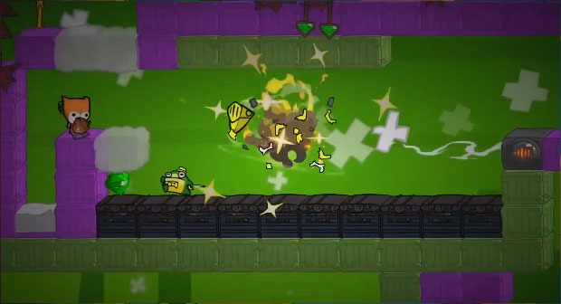 Once upon a time, self-made billionaire, cat fanatic and theater aficionado Purrham Furbottom set out to create the biggest, richest, and most awe-inducingest theater the world had ever seen. Then, years later, when the legendarily loyal Hatty Hattington and hundreds of his best friends set out to sea with sweet, sugary adventures in mind, something horrible happens. The sea becomes uneasy—NO, IT BEGINS TO SWELL WITH WRATH AND CHURN WITH ENVY—and Hattington, along with his whole entourage of hand holding, song singing besties, are thrown overboard by the raging sea. While few are left to speculate why this fate has befallen them, others are horrifically eaten by, er, “sharks,” and any survivors live only to wander the waves in the ruins of their crushed friendship. When the game finally begins, two prisoners emerge from the wreckage and find themselves washed up on a mysterious island that just so happens to house Furbottom’s grand theater. But something is amiss. It seems as though Hatty has been kidnapped by the island’s hideously adorable inhabitants, and is being forced to wear some kind of glowing, evil looking hat! Before you have time to look away, Hatty orders his captors to apprehend you, and everything goes black… This is the premise of The Behemoth’s new puzzle platformer, Battleblock Theater. Devoid of expression and completely expendable, it is up to you and your partner to uncover the supernatural conspiracy surrounding the island and its mutant, but considerably cuddly, feline denizens. Narrating your adventure is Newgrounds contributor Will Stamper, whose spastic monologues are comparable to and often mistaken for Richard Steven Horvitz. His unique brand of eccentricity helps to move the story along humorously, and albeit riddled with poop jokes, there’s no doubt that you’ll find Stamper’s frighteningly accurate observations of cat behavior and dramatically exaggerated summaries of your in-game efforts entertaining.