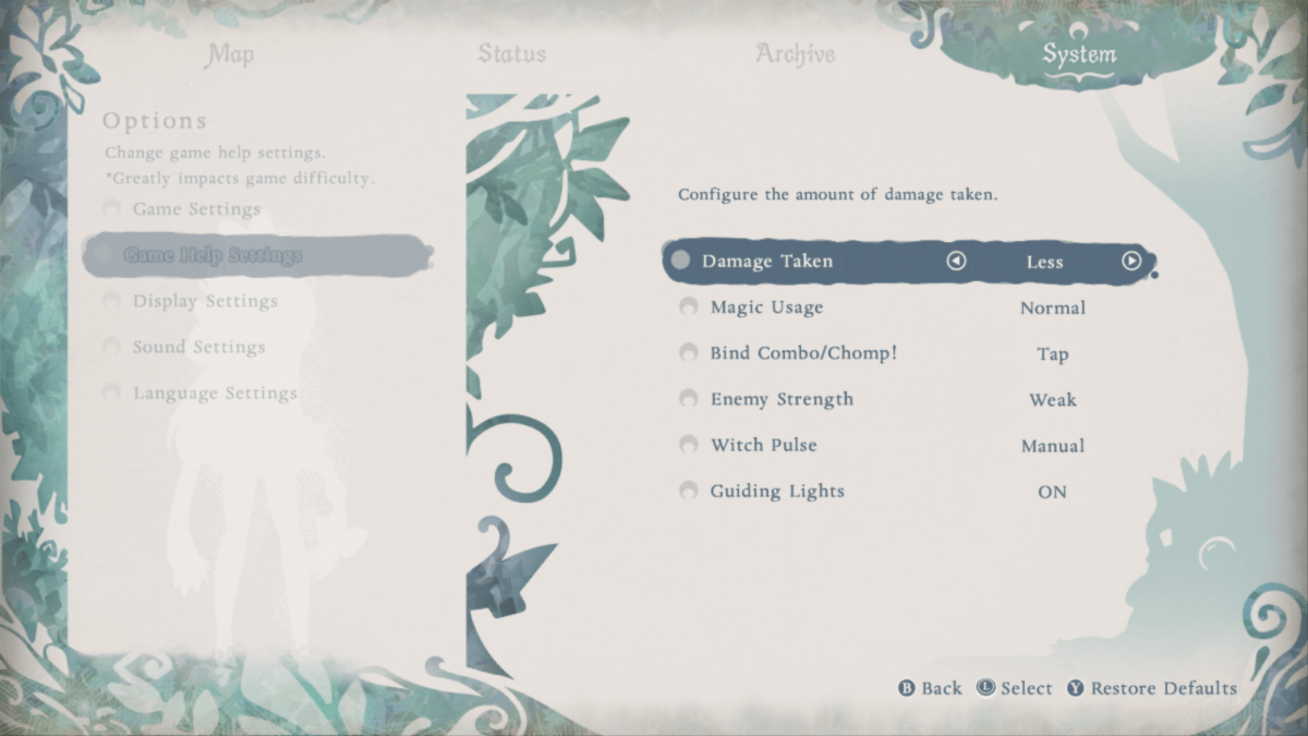 Nintendo also shared a screenshot of the Bayonetta Origins accessibility menu in the options. People can determine how much damage Cereza will take from enemy attacks, with some options involving taking less or no damage. You can select magic usage to determine how much is used. You can change Cheshire’s combo/champ to tap or hold. Enemy strength can be set. You can manually input Cereza’s rhythm-based witch pulse or have it automatically perform while you hold a button. It is also possible to have a Guiding Light appear to lead you to central safe sanctuaries with save points.