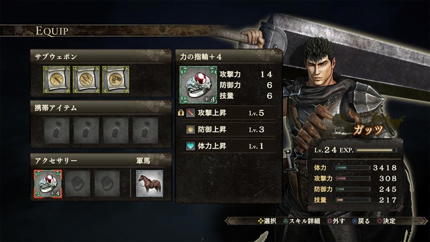 In Berserk and the Band of the Hawk, you’ll get to power up characters through equipment. Equipment consists of accessories used to increase character abilities, usable items that support in battle, and battle horses used for transportation. Accessories and usable items can be purchased at the shops before battle. Again, you’ll get to use materials to upgrade capabilities and skills of accessories. You can also combine accessories to make even stronger ones as well.