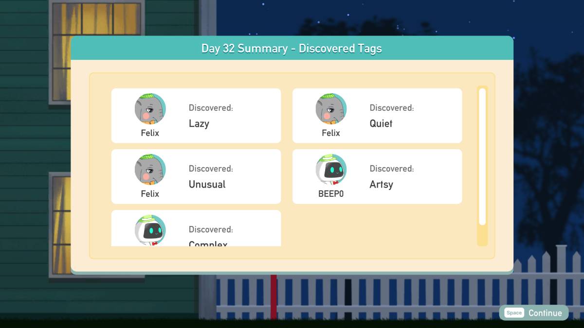 Press the space button or click with your mouse when you see that icon appear next to the door of a character’s room. You will then be able to select a gift from your inventory, then choose which other house resident you’d like to note is the “giver.” Once you do that, you use one action point to confirm and give the gift.
