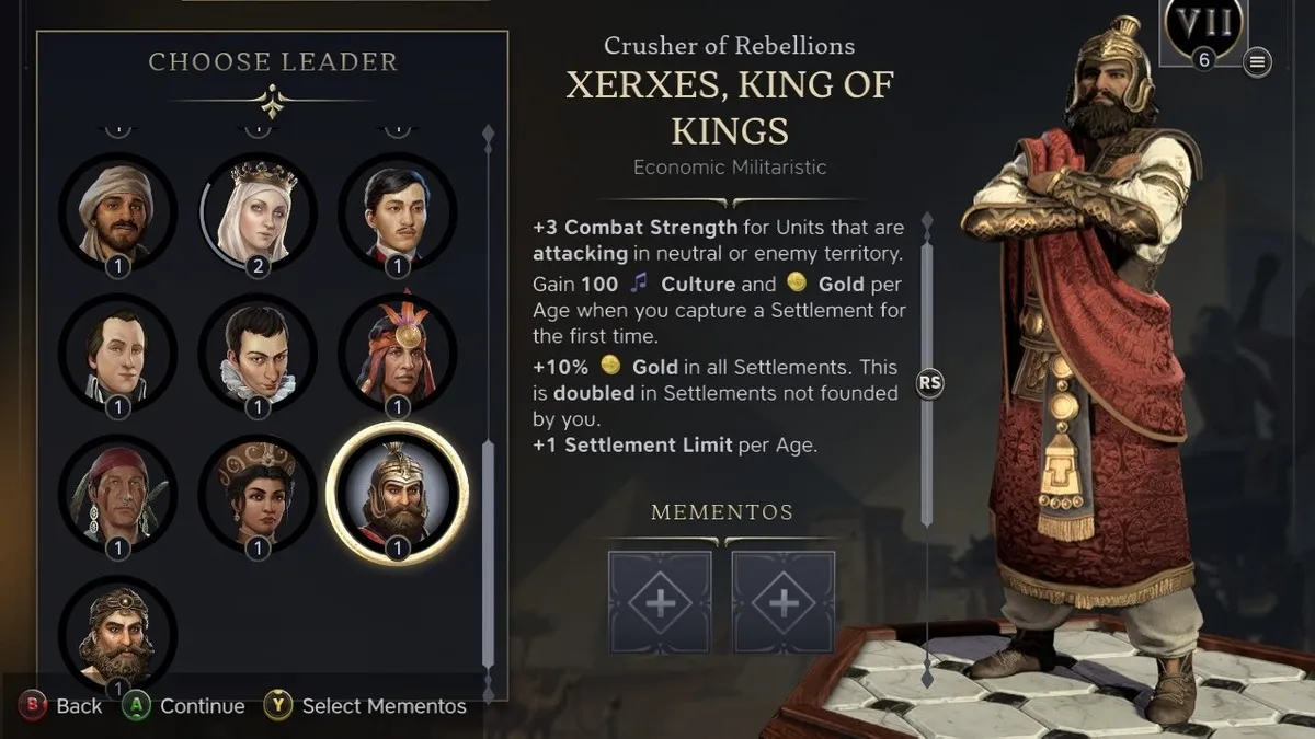 There are quite a lot of solid Military-themed leaders you can pick. But, for me, the one I pick for Military players, especially newcomers, is Xerxes, King of Kings. His ability to get boosted Combat Strength majority of the time, plus more settlements, and Gold is always helpful this route.