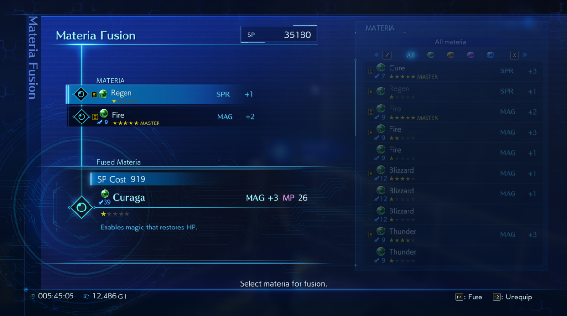 Well, you start off the game with Cure for Zack. Which is great, because you definitely need it. However, as soon as possible you’ll want to try and get your hands on a Cura or Curaga. Curaga is the absolute best healing materia in Crisis Core. It heals a lot of health, you can use Dualcast with it, and it only costs 26 MP compared to the 64 MP Full Cure. It is also pretty easy to get. If you use materia fusion, you can combine a Fire and a Regen to get one. As noted by our other Crisis Core expert Kazuma, keeping the Fire materia you start with and running Training Mission M1-1 until its mastered can help prepare it for this fusion. For Regen, you can get it for 5,000 Gil from the Happy Turtle or get it as a mission reward.