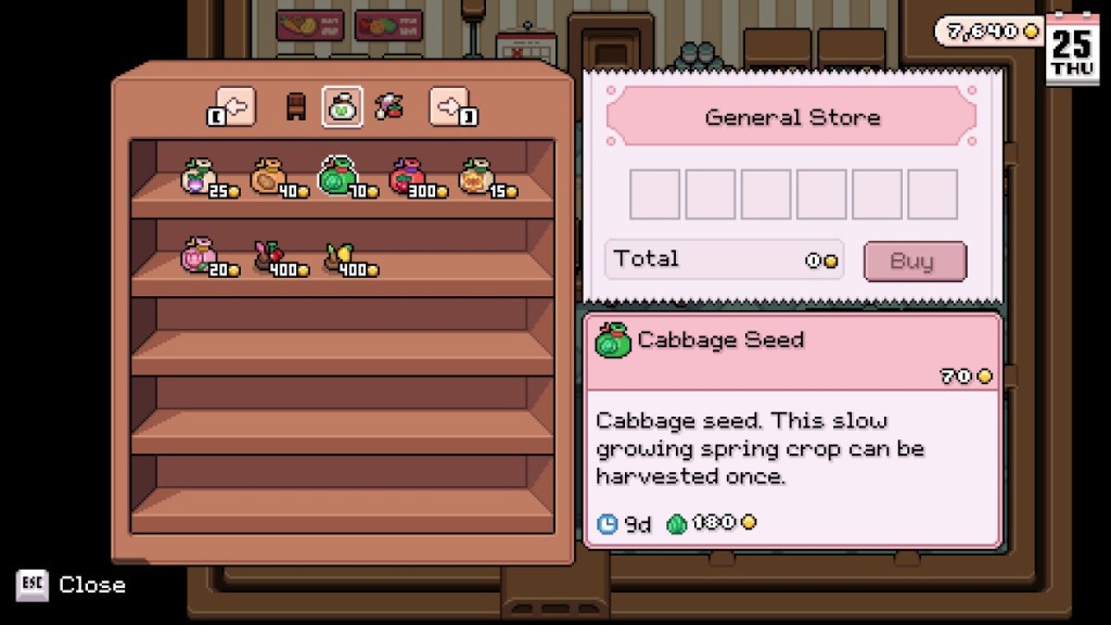 A good intermediate option for Spring crops is the Cabbage. Cabbage seeds can be purchased at the general store for 70 tesserae. Conveniently, your first potato harvest should cover the cost of a decently sized cabbage patch! It may seem like the nine days of growth required to harvest cabbage aren’t worth the investment, but they most definitely are. Cabbage sells for 180 tesserae, averaging out to about 12 tesserae per day of profit while growing them. This is double the amount per day yielded by potatoes and carrots! Because the best crop for Spring has a hefty price tag, it’s a good idea to farm Cabbage early-on until you build a cushy amount of savings.
