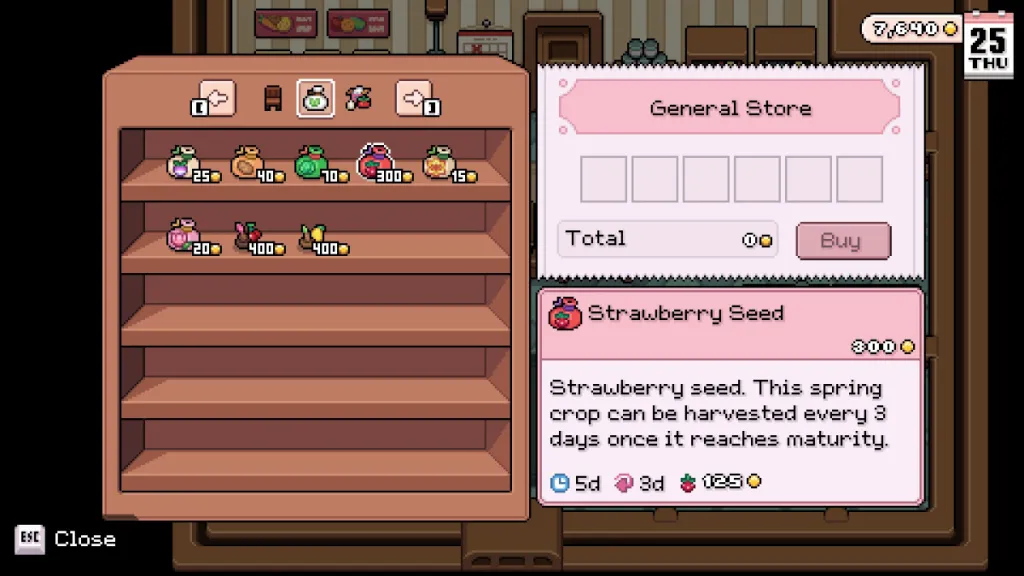 By far the best crops to plant in the Sprinng are Strawberries and Peas. These two are the only Spring crops that can produce multiple harvests off of one seed. Planting them on the first day of the season will net you eight harvests! To sweeten the deal, peas and strawberries reach maturity in less time than both cabbages and potatoes as well. The challenge to using these crops is their price tag. It’s 300 tesserae per seed. But when each strawberry is worth 125 tesserae, you’ll make your money back in due time. You won’t have access to peas until you make progress repairing Mistria, but once you do replace your strawberries. Peas sell for 10 tesserae more, making them objectively better.
