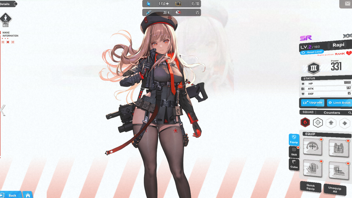 While Rapi is one of the earlier Nikkes the game provides, she is still a very useful starter unit. Her assault rifle gives her the ability to maintain constant heat on enemies. Her III Burst Skill, Warhead Volley, is also good for leveling the playing field by targeting the foe with the strongest attack stat.