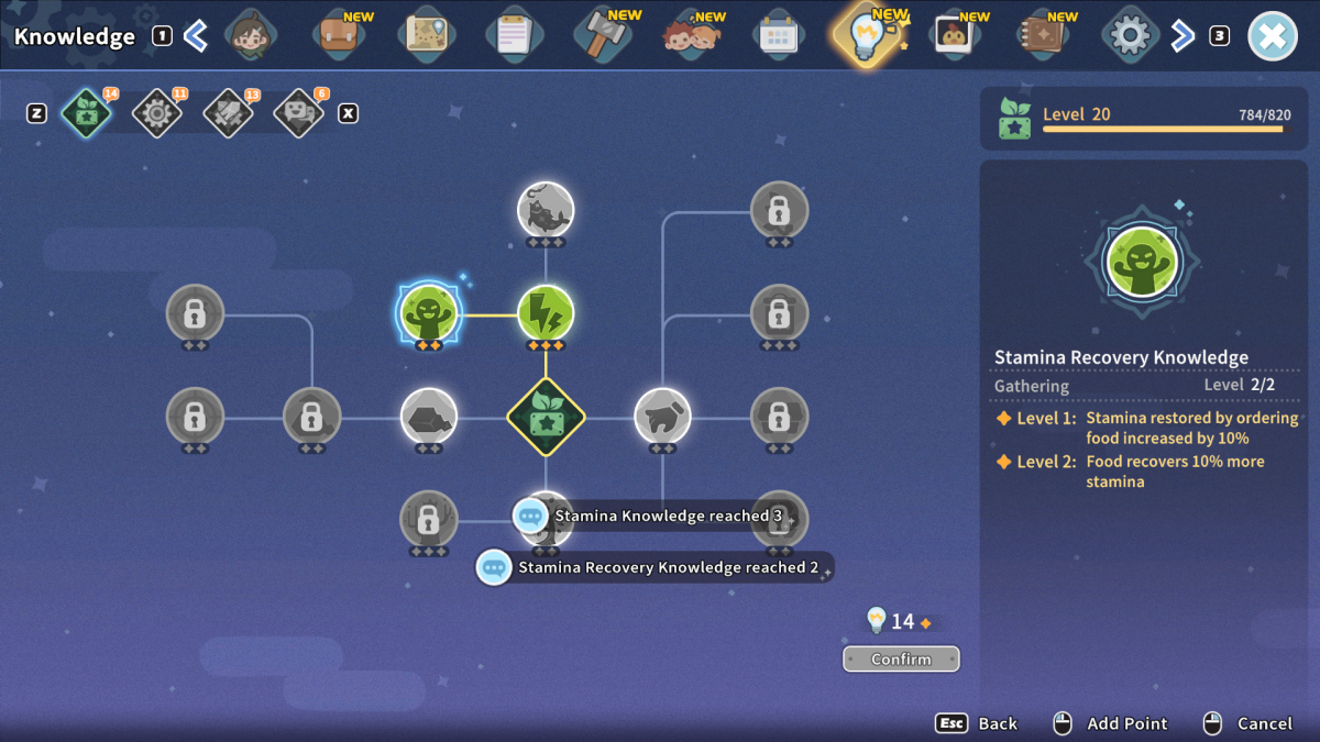 Early on in Sandrock, you’ll find your stamina to be your biggest limitation. Without it, you won’t be able to smack rocks, cut trees, or otherwise gather the resources you need to progress. Therefore, your highest priority skills in this tree should be the Stamina and Stamina Recovery Knowledge Skills. Stamina Knowledge gives you a +10% boost to your max stamina that’s really useful, and because it’s percentage based it should amplify any flat bonuses you get from relationship perks. While you can hold off on the 3rd level of the skill until later, the ability to stay up late without losing out on the buffs from being well rested will be really useful later.