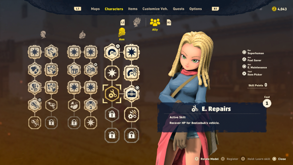 Ann is a strange case since she permanently joins your party well into the game. It is very likely that you won’t have many skill points reserved for her, and she will take a bit longer than Rao or Thief to shine. However, her skill tree is extremely valuable, and it allows you to choose from a series of buffs or healing abilities focused on vehicles.