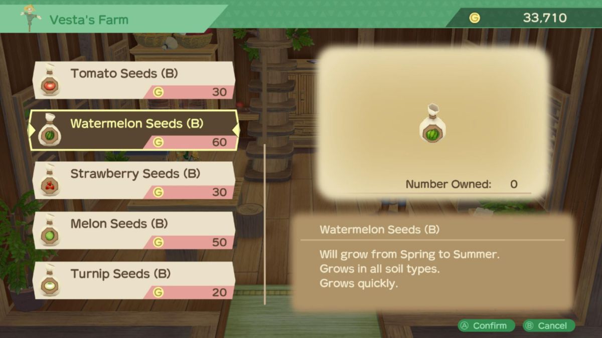 - Watermelon, 7-day growth time—60 Gold per seed at Vesta’s Farm (B Grade).