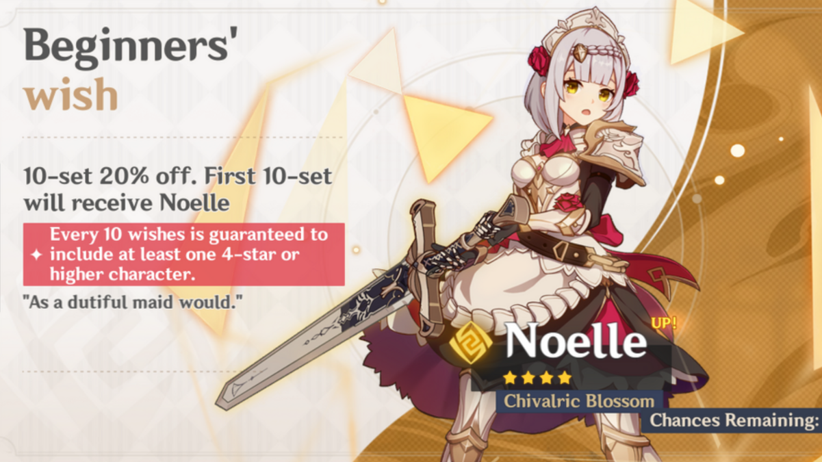 The Beginners’ Wish in Genshin Impact is a gacha banner exclusive to novice players of the game, giving you a basic pool of 4-star and 5-star characters to potentially get. While the Beginners’ Wish banner doesn’t include later standard characters like Tighnari or Dehya, you can pull on it for 20% less Acquaint Fates and you will always get Noelle in your first 10-pull. As a note, you can only pull on the Beginners’ Wish banner 20 times (2 10-pulls) before it goes away. So if you’re adamant on getting the characters you want from this particular banner, you don’t have that many chances.