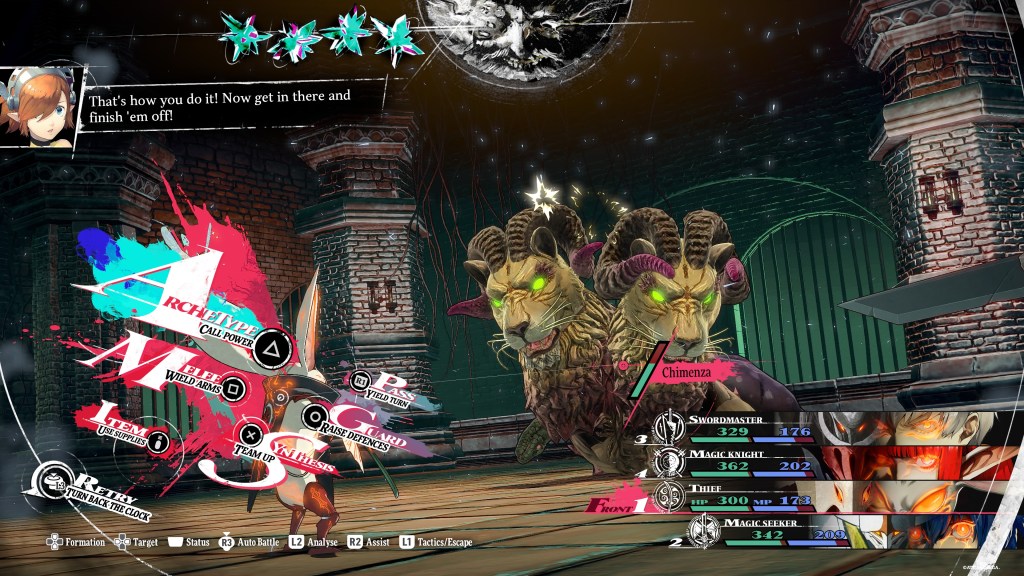 Which means the best order to free the group in Metaphor: ReFantazio is to start with Heismay, unleash Hulkenberg, and finally set Strohl loose. This is because the enemy tied to Strohl is a Chimenza. While you’ll later encounter this as a “normal” enemy in dungeons, it’s pretty intimidating here! The best weakness to exploit is wind magic like Cyc. Since your avatar starts as a Seeker that learns it, make sure that spell is set as an inheritance. You also should have the Mage Wind Igniter from the beginning of the game that you can equip on someone else. (Strohl had it in my game.)